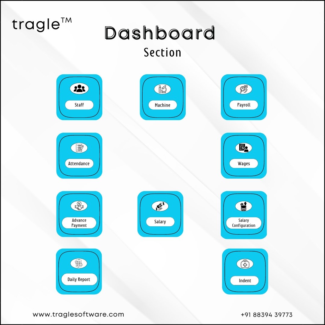 managing staff, machines, payroll, attendance, and wages. It also includes tools for handling advance payments, configuring salaries, daily reporting, and indent management, ensuring seamless project and workforce oversight.